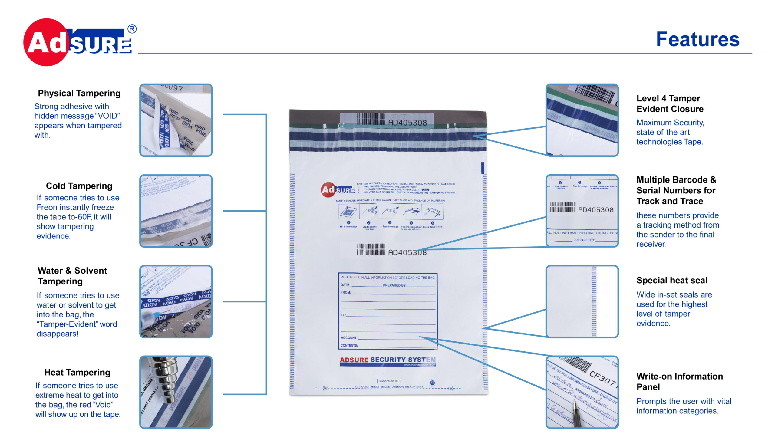To combat transit shrinkage, industry leaders turn to specialized manufacturers like Adsure Packaging. With over 40 years of manufacturing experience, Adsure has emerged as a globally trusted producer of tamper-evident security bags, designed to provide maximum protection for cash, sensitive documents, and high-value items. Adsure® security bags are purpose-built for retail chain stores and offer a comprehensive set of security features that standard packaging simply cannot match.